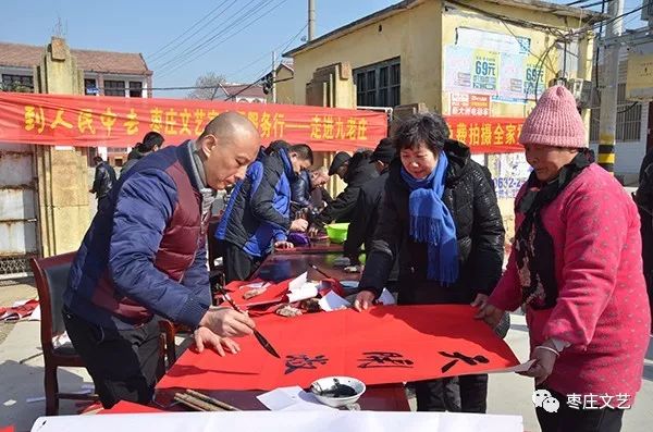 为深入贯彻落实党的“十九大”精神,2月13日,枣庄市文学艺术界联合会组织广大文艺家、文艺工作者参与“脱贫攻坚”活动。市文联党组书记、主席王延亮带领书画摄影家们冒着严寒,带着米面油、慰问金、笔墨纸及照片冲印设备走进山亭区冯卯镇九老庄村,为困难户、孤寡老人现场裁写春联、福字,摄影家为村民拍“全家福”,并现场冲印,深受群众欢迎。