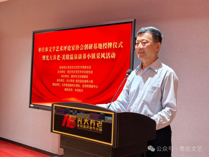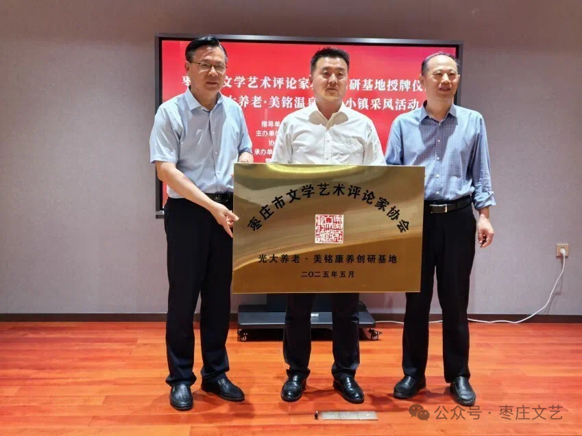 启动仪式分为授牌仪式和康养小镇采风两个阶段。授牌阶段,范警华首先致辞,表达了对创研基地未来发展的殷切期望。随后,李从望、闵凡利将“枣庄市文学艺术评论家协会光大养老·美铭温泉康养小镇创研基地”铜牌授予公司总经理朱联合。