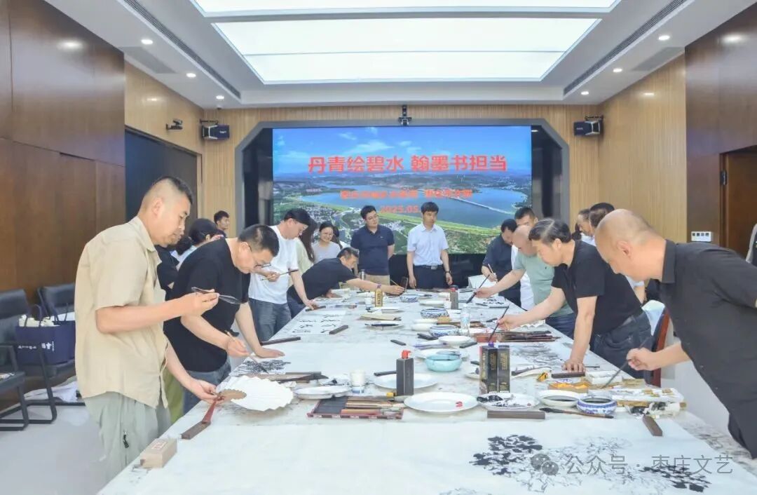 活动中首先组织艺术家们深入庄里水库开展文艺采风,感受山川之美,品味河湖水韵,汲取创作灵感,涵养家国情怀,澎湃奋进力量。摄影艺术家们用镜头捕捉了庄里水库山清水秀的生态环境和古朴淳厚的人文风情。采风结束后进行了座谈交流和书画笔会,市摄影家协会向庄里水库管理服务中心捐赠了摄影作品,10余位书画艺术家围绕“丹青绘碧水 翰墨书担当”主题进行创作,大家泼墨晕染,勾勒出庄里水库与周围山水相映的宜人风景,“烟波浩渺”“湖上春来似画图”,以文艺力量宣传了河湖之美,充分展现了我市在持续推进水源地生态保护,打造“水清、岸绿、景美”的生态长廊方面取得的卓然成效。