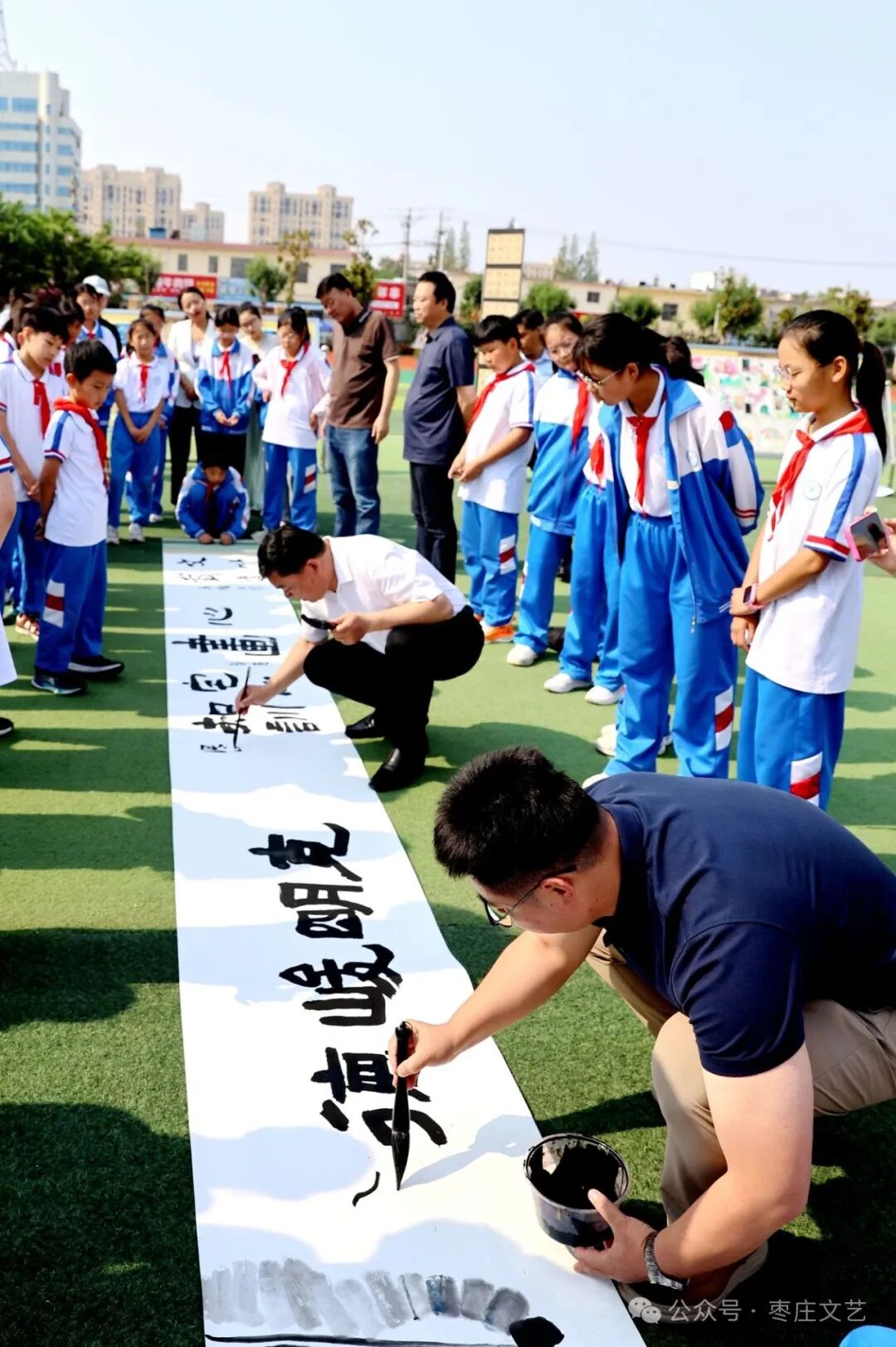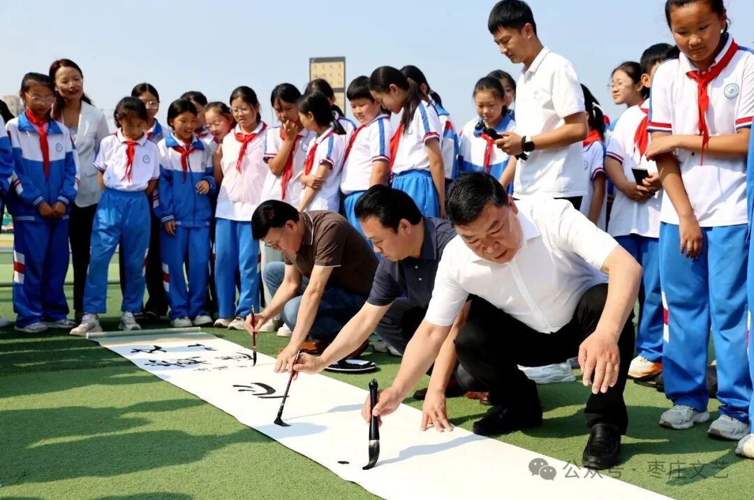 书法家和同学们共同书写了“百米书画长卷”。与会人员先后观看了学校诗书诵读、音乐节目展演等社团活动,并为峄城区翰林小学授予“山东省青年书法家协会翰林小学教育实践基地”“枣庄市书法家协会翰林小学教育实践基地”称号。
