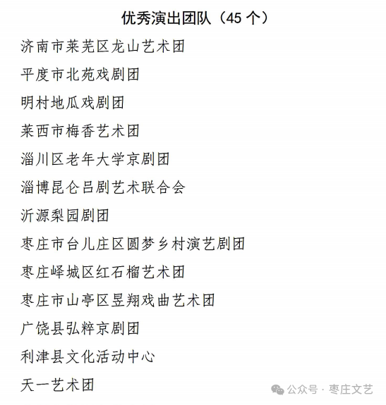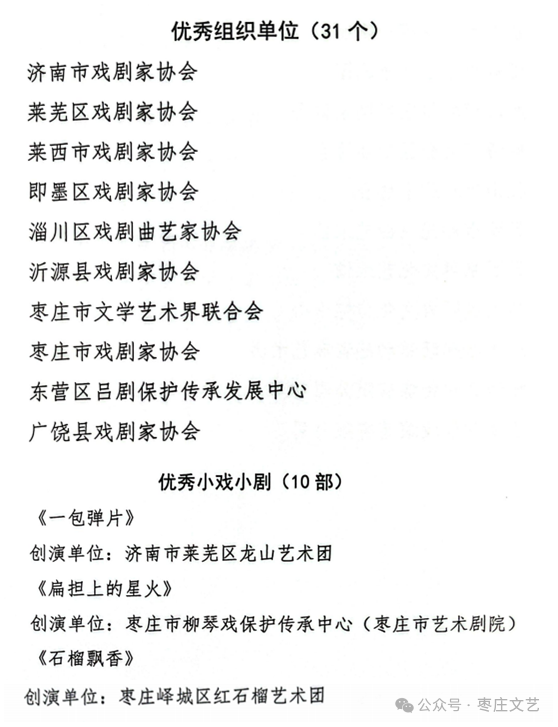 在本届展演月中,市文联与市戏剧家协会被授予“优秀组织单位”称号;我市基层文艺团队台儿庄区圆梦乡村演艺剧团、峄城区红石榴艺术团、山亭区昱翔戏曲艺术团荣获“优秀演出团队”称号;在剧目创作方面,我市两部作品《扁担上的星火》《石榴飘香》凭借鲜明的时代气息与生动的艺术表达,荣获“优秀小戏小剧”奖。