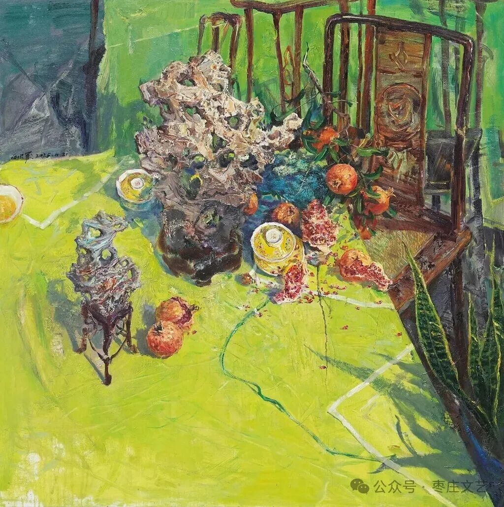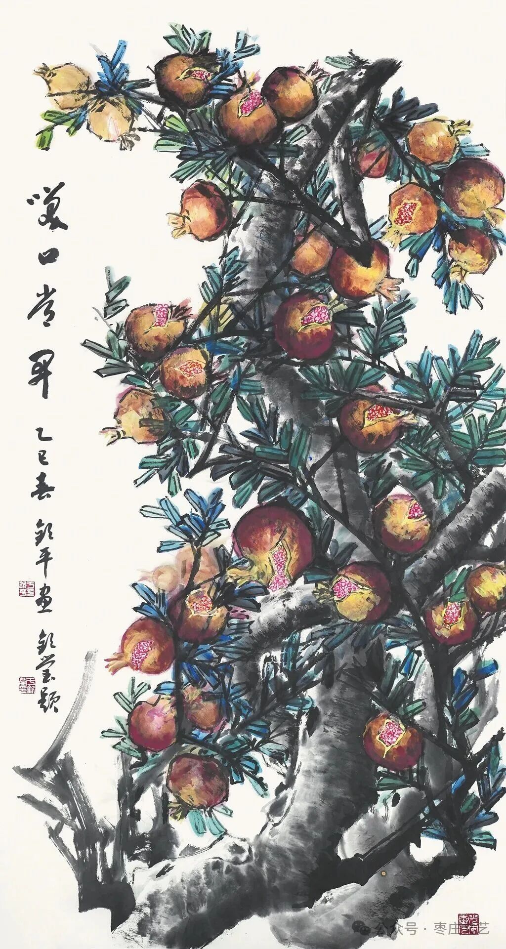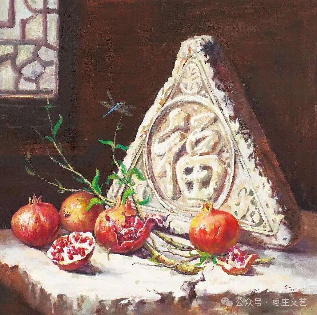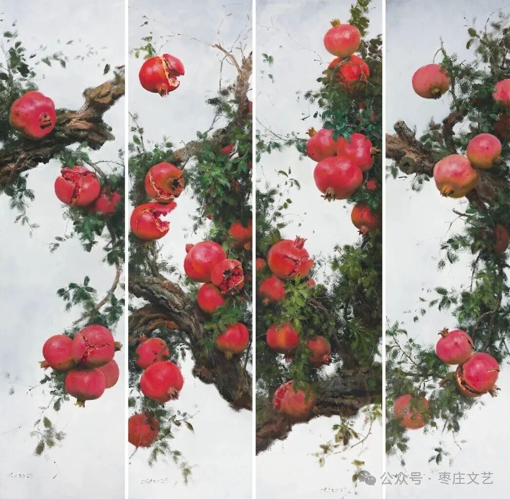 枣庄作为“中国石榴之乡”,既有万亩榴园的壮丽景观,更承载着深厚的石榴文化。近年来,枣庄以石榴为纽带,打造了国家级石榴种质资源库、中国石榴博物馆等文化地标,推动石榴产业与文化旅游深度融合。习近平总书记视察枣庄时,曾殷切期望乡亲们的生活“像石榴果一样红红火火”。这为石榴文化的传承与创新注入了强大动力,为石榴这一古老的绘画题材赋予了全新的文化内涵和现实意义。“夫画者,成教化、助人伦、穷神变、测幽微,与六籍同功。”张彦远在《历代名画记》中的论断,揭示了艺术服务社会、启迪人心的重要价值。“榴香齐鲁·艺绘华章”山东省首届石榴主题美术作品展的举办,不仅是一场艺术盛宴,更是一次文化传播与精神传承。它让我们在欣赏石榴之美的同时,更深切的感悟到了中华文化的博大精深,激发了对美好生活的无限向往。愿此次展览如榴花般绚烂,似榴实般丰硕,为弘扬中华优秀传统文化、推动新时代美术事业发展绘就佳篇。