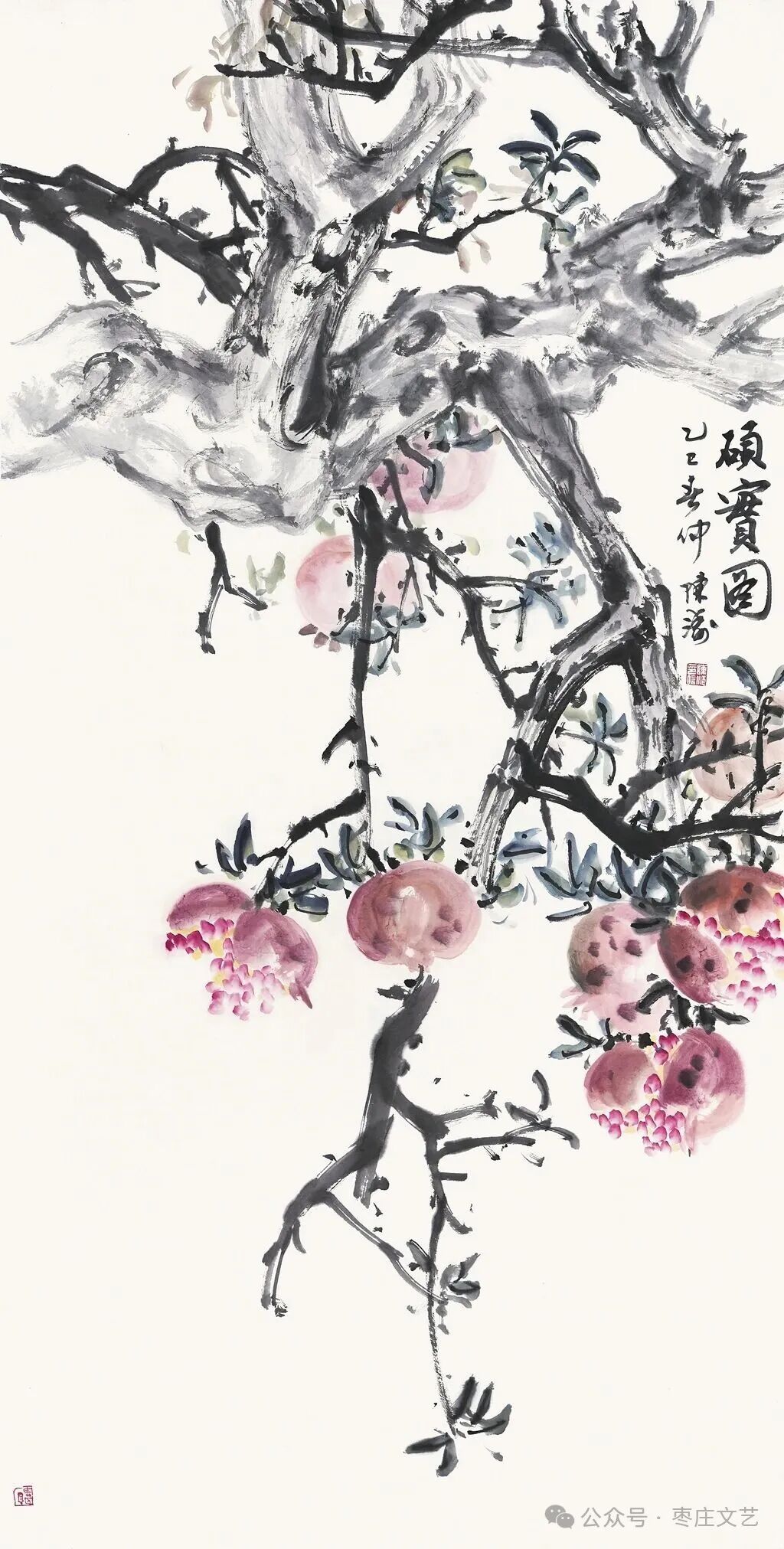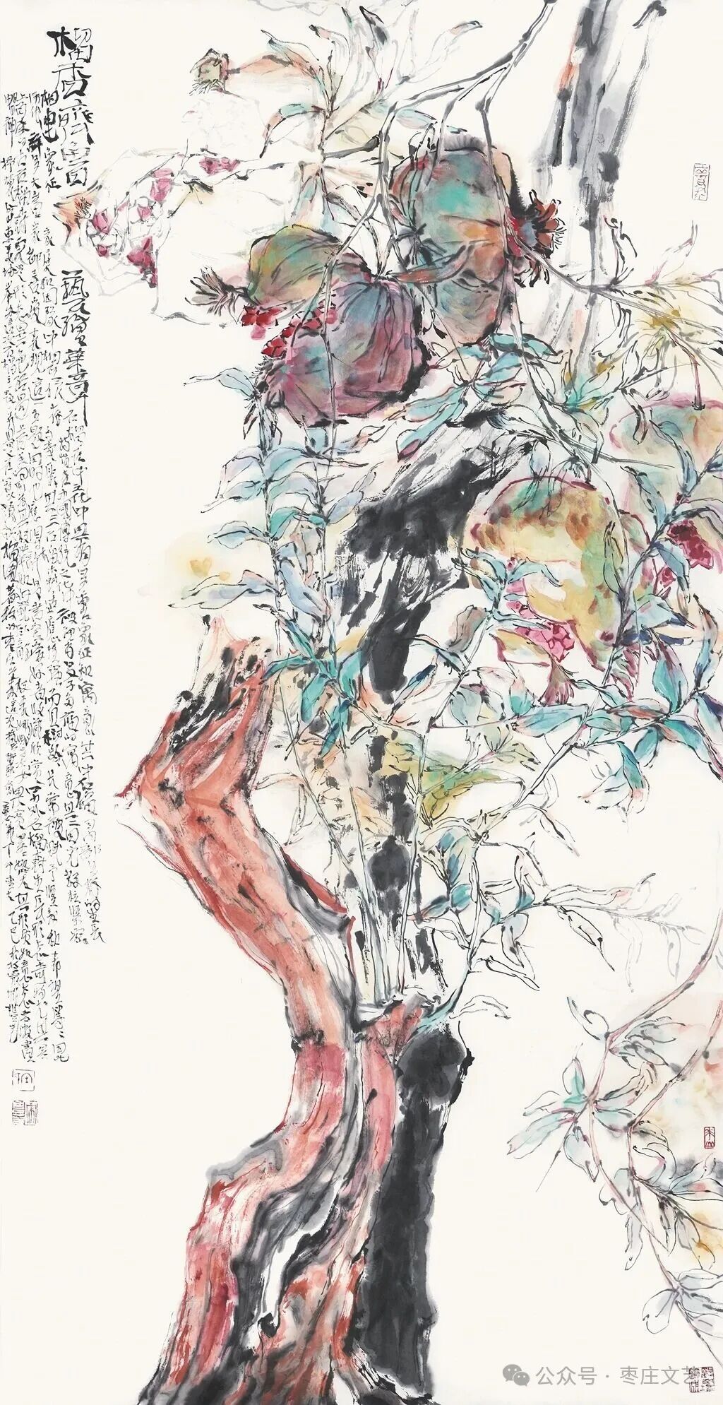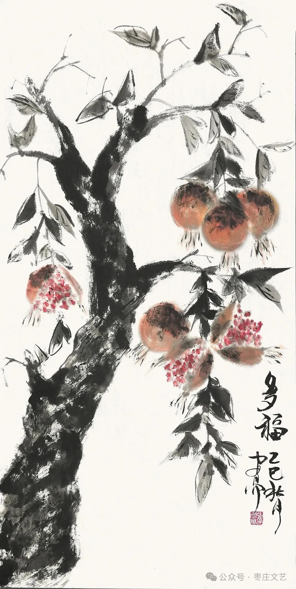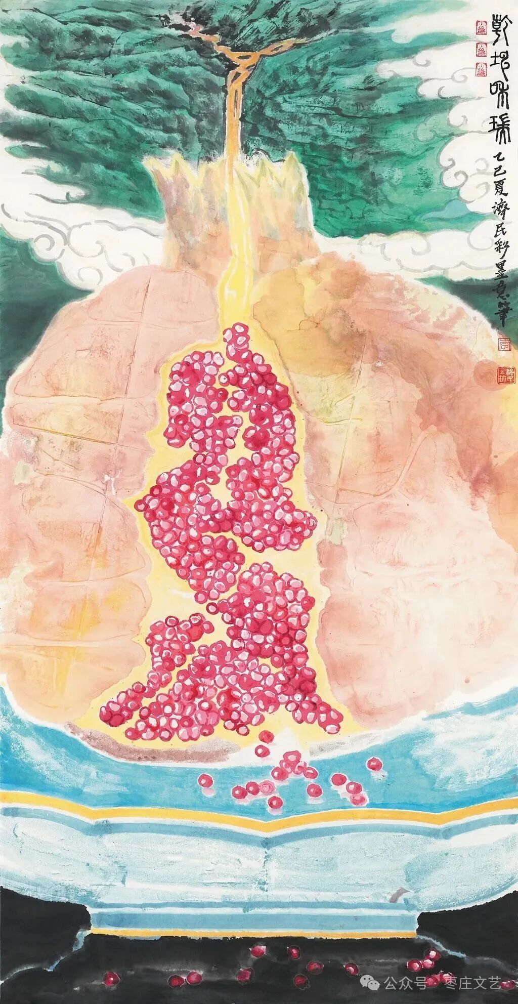 枣庄作为“中国石榴之乡”,既有万亩榴园的壮丽景观,更承载着深厚的石榴文化。近年来,枣庄以石榴为纽带,打造了国家级石榴种质资源库、中国石榴博物馆等文化地标,推动石榴产业与文化旅游深度融合。习近平总书记视察枣庄时,曾殷切期望乡亲们的生活“像石榴果一样红红火火”。这为石榴文化的传承与创新注入了强大动力,为石榴这一古老的绘画题材赋予了全新的文化内涵和现实意义。“夫画者,成教化、助人伦、穷神变、测幽微,与六籍同功。”张彦远在《历代名画记》中的论断,揭示了艺术服务社会、启迪人心的重要价值。“榴香齐鲁·艺绘华章”山东省首届石榴主题美术作品展的举办,不仅是一场艺术盛宴,更是一次文化传播与精神传承。它让我们在欣赏石榴之美的同时,更深切的感悟到了中华文化的博大精深,激发了对美好生活的无限向往。愿此次展览如榴花般绚烂,似榴实般丰硕,为弘扬中华优秀传统文化、推动新时代美术事业发展绘就佳篇。