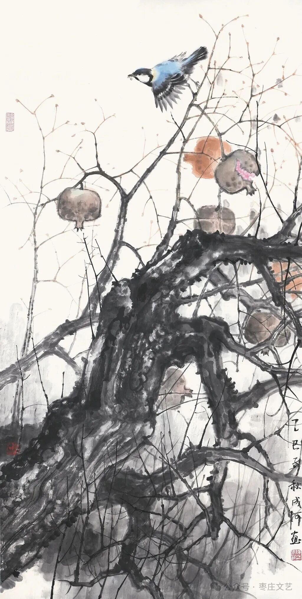 此次展览作品在技法与意境上均有突破。工笔画家以没骨法、淡彩法勾勒石榴的玲珑剔透,线条细腻,色彩清新,尽显自然灵韵;写意画家则以酣畅笔墨挥洒胸臆,枝干虬劲,果实饱满,暗藏精神力量。更有创作者将人物、山水融入石榴图景,拓展了题材表现维度,使作品既含传统笔墨韵味,又具现代审美气息。这些作品不仅是对石榴外在形态的描摹,更是创作者对生命、自然与家国的深情告白。